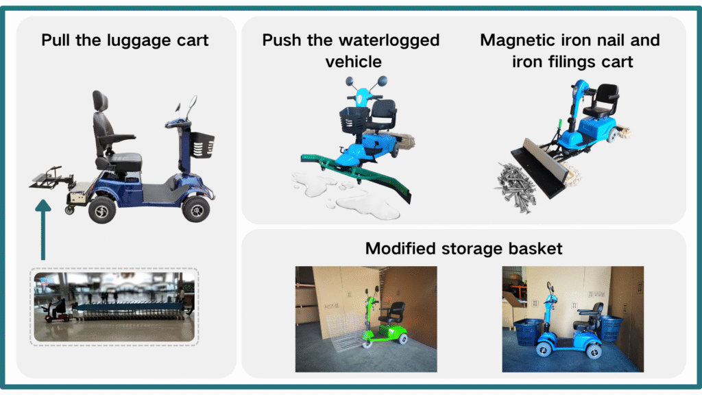 It can be used for cargo towing in airports and logistics centers, clearing water accumulation in basketball courts and parking garages, as well as cleaning metal debris (such as iron nails and iron filings) in factory workshops. After installing the storage baskets, it can be used for storage or for picking goods in supermarkets, and can also be used for transportation when shopping in supermarkets.